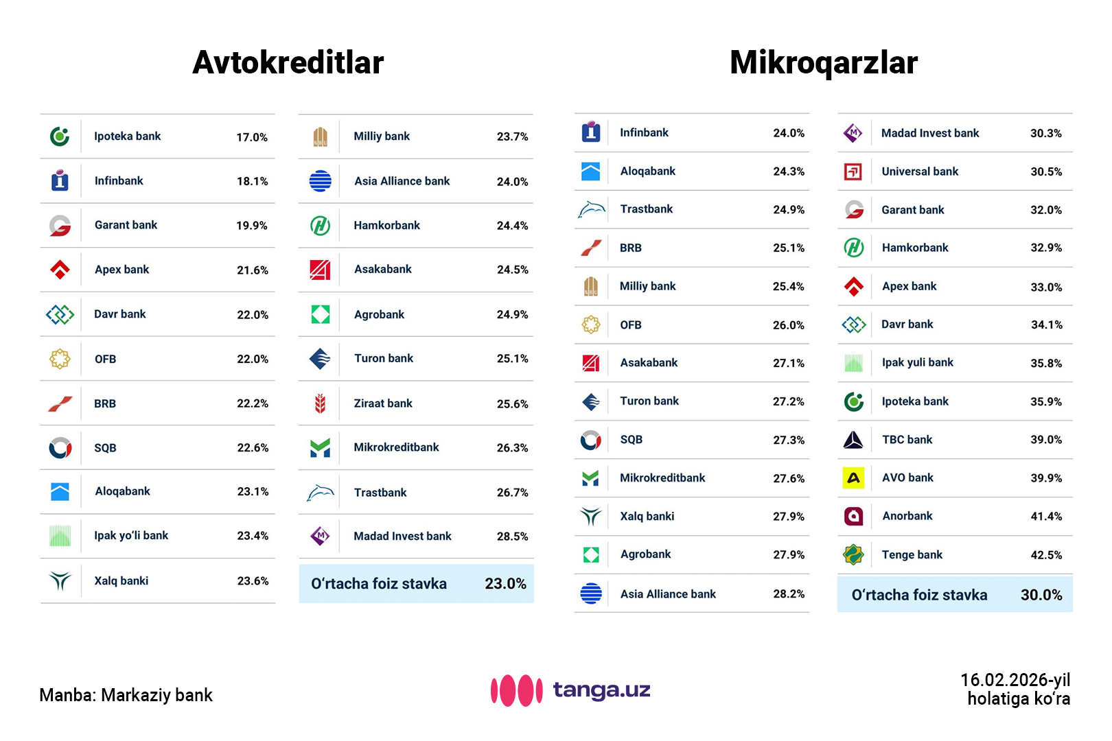 16-fevral holatiga ko‘ra, tijorat banklarida mikroqarzlarning o‘rtacha yillik foiz stavkasi 30 foizni tashkil etmoqda.