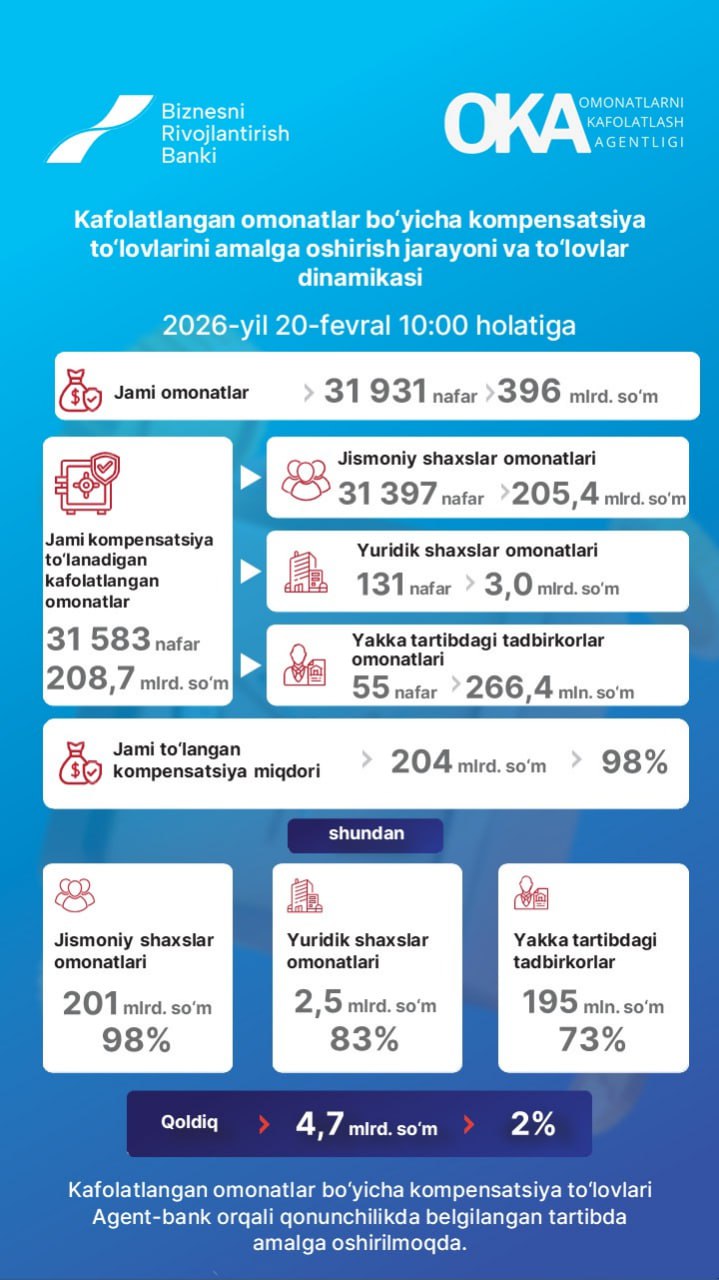 20-fevral soat 10:00 holatiga ko‘ra, Yangi Bank omonatchilariga 204 mlrd so‘m to‘lab berildi.