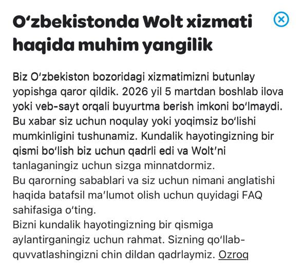 Wolt yetkazib berish xizmati O‘zbekiston bozorini tark etmoqda. Bu haqda kompaniya o‘z mobil ilovasida xabar berdi.