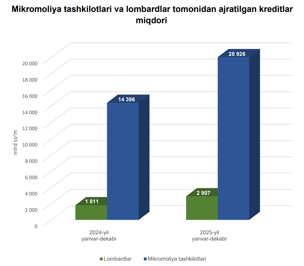 2025-yilda mikromoliya tashkilotlari va lombardlar tomonidan jami 31,8 trln so‘m miqdorida kredit ajratildi.