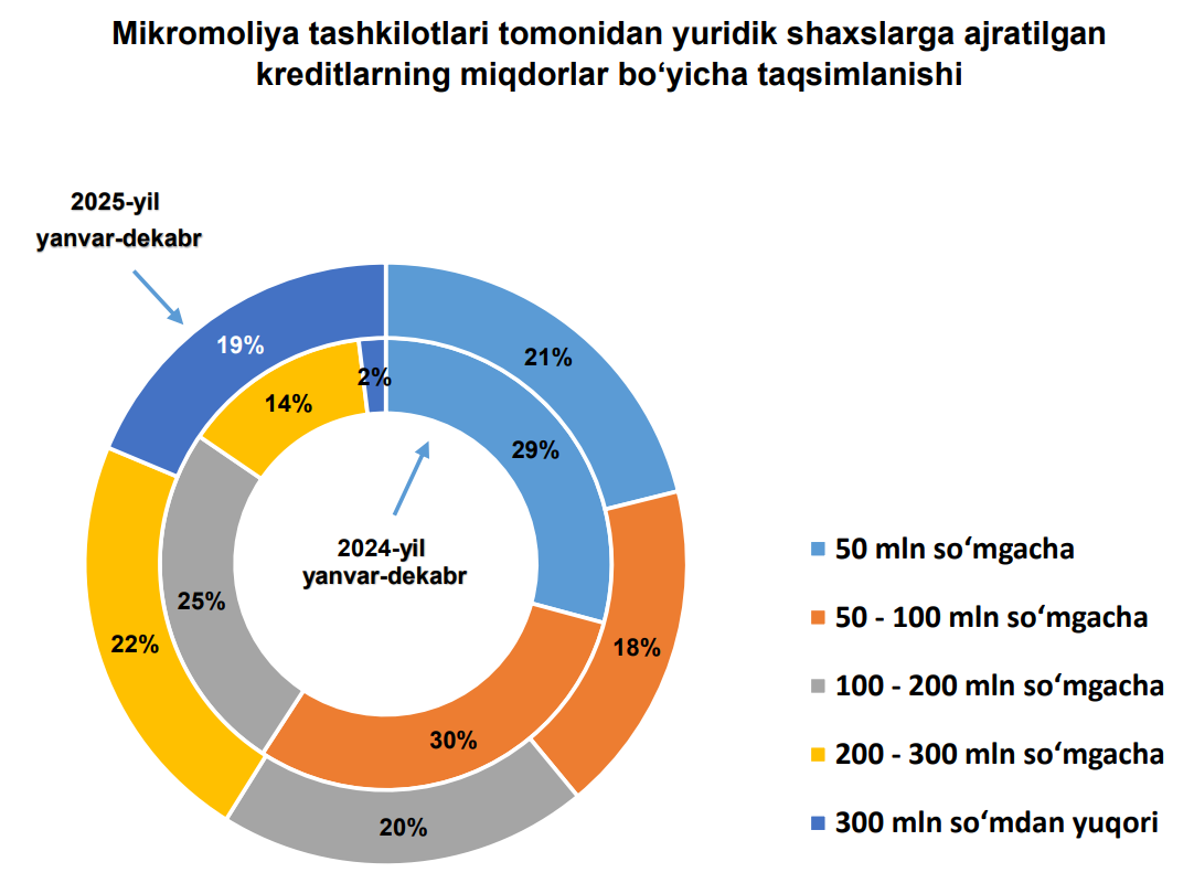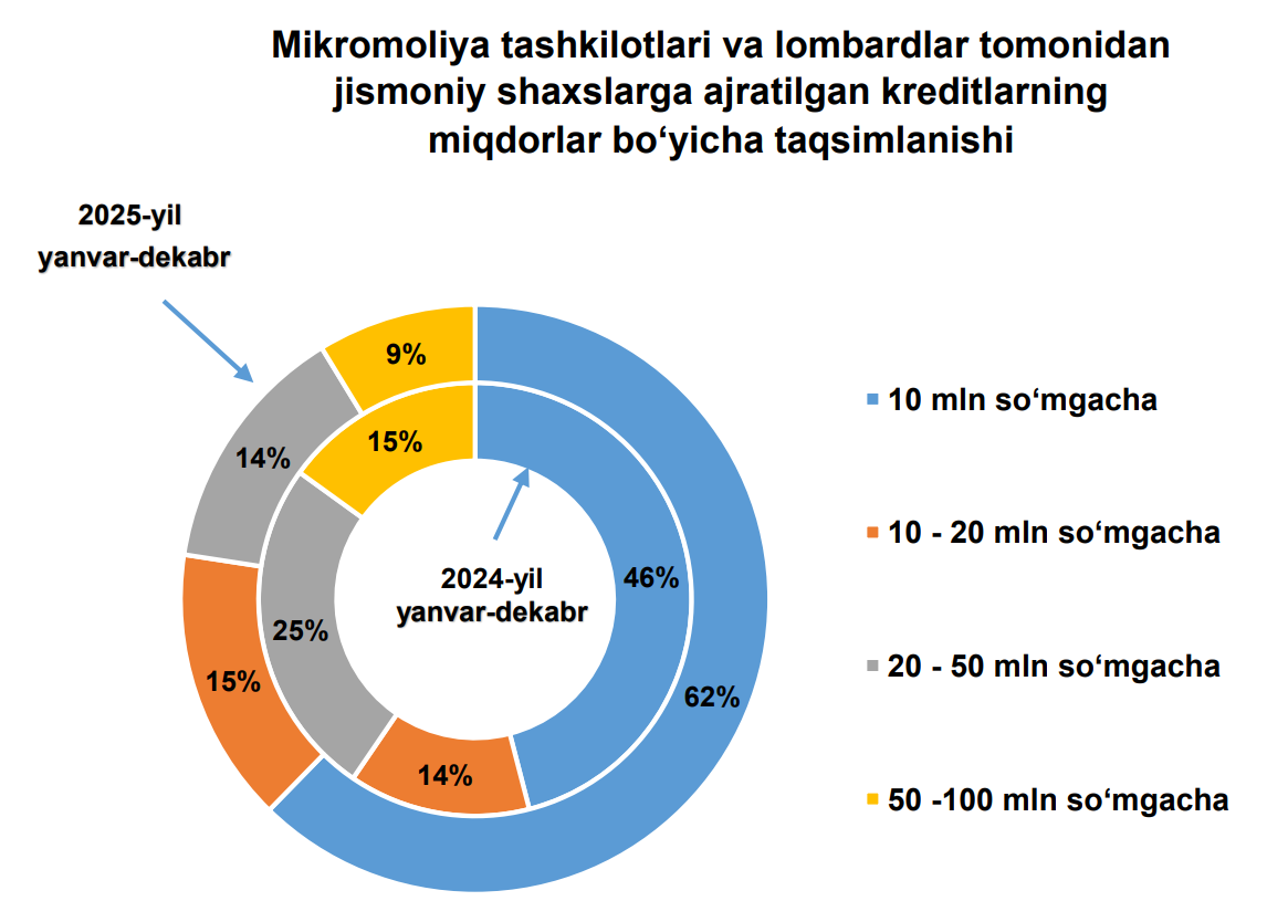 Ajratilgan kreditlarning 91 foizi yoki 28,9 trln so‘mi mikromoliya tashkilotlari, 2,9 trln so‘mi esa lombardlar hissasiga to‘g‘ri keladi.