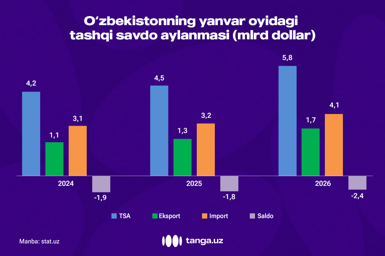 2026-yilning yanvar oyida O‘zbekistonning tashqi savdo aylanmasi 5,8 mlrd dollarni tashkil qildi.