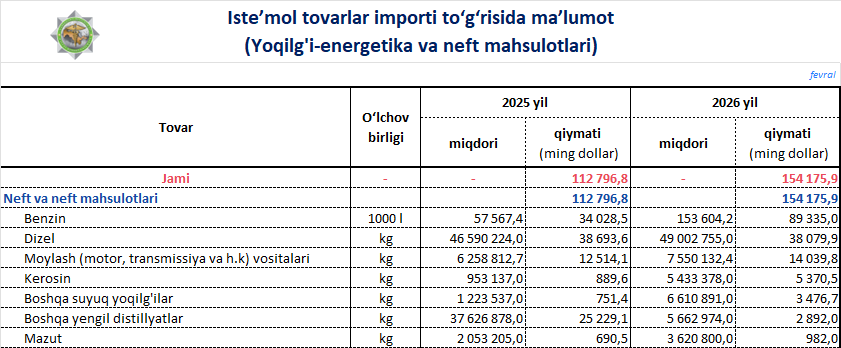 2026-yilning fevral oyida O‘zbekistonga 154,2 mln dollarlik neft va neft mahsulotlari import qilindi.