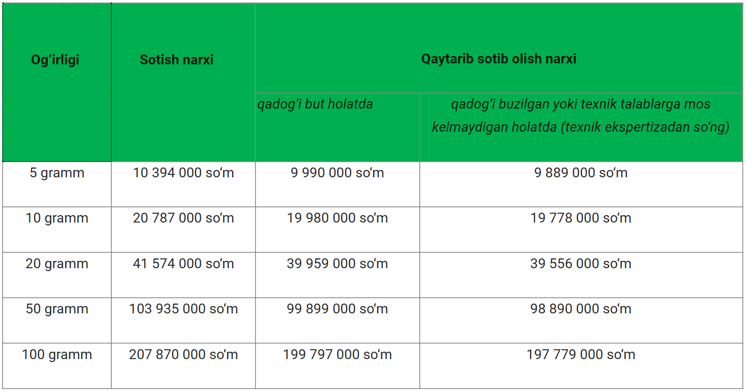 Ma’lumot uchun, @tangauz_news Telegram kanalida oltin quymalari narxlarining kunlik o‘zgarishi berib boriladi.