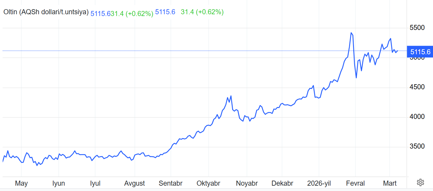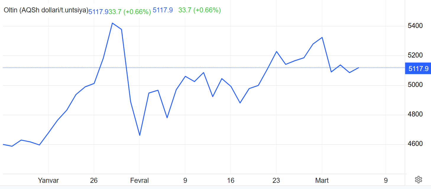6-mart kuni soat 11:20 holatiga ko‘ra, jahon bozorida oltinning bir troy unsiyasi narxi 5120 dollarni tashkil etmoqda.