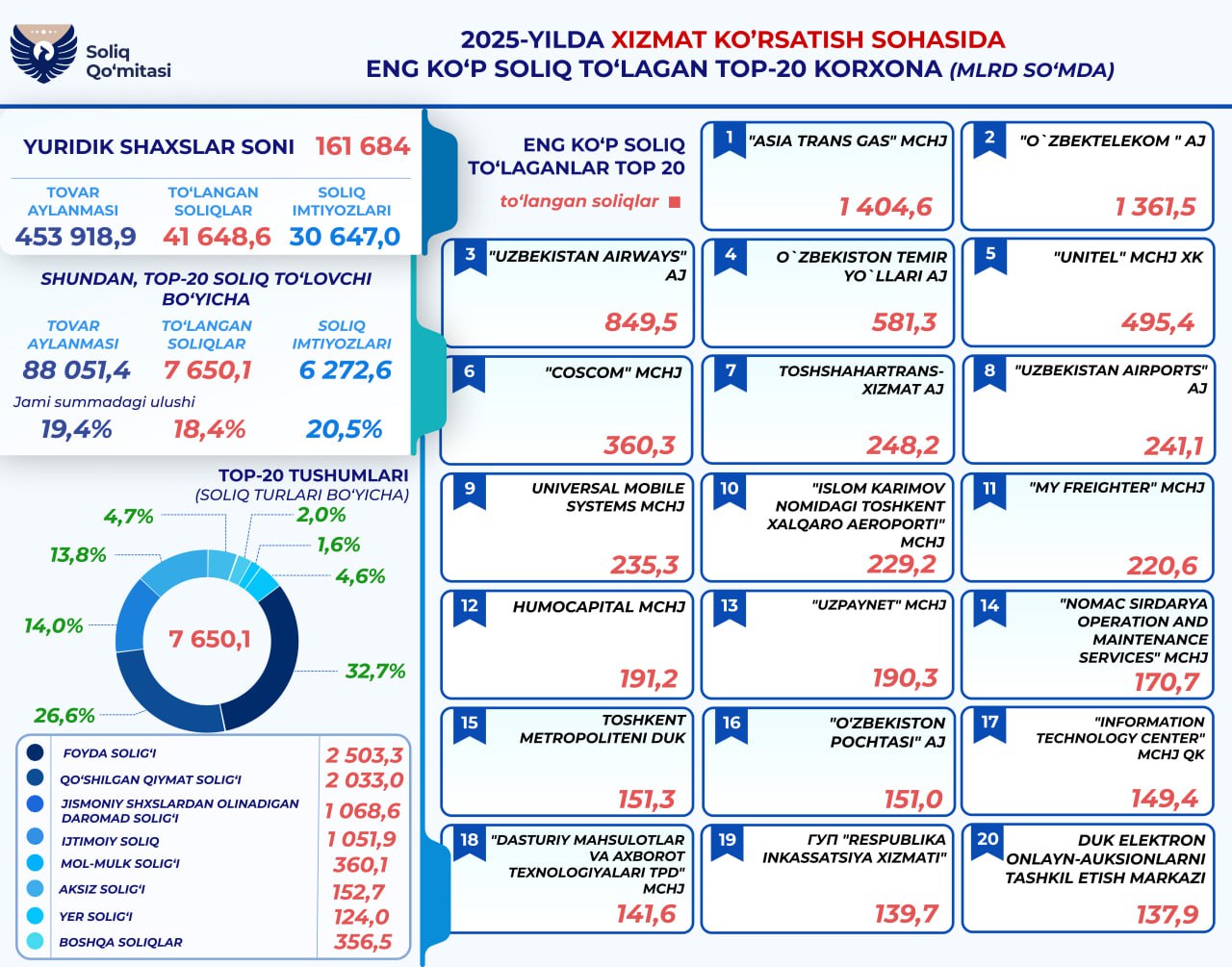 2025-yilda xizmat ko‘rsatish sohasidagi kompaniyalar 41 trln 645 mlrd so‘m soliq to‘ladi. Bu haqda Soliq qo‘mitasi ma'lumot berdi.