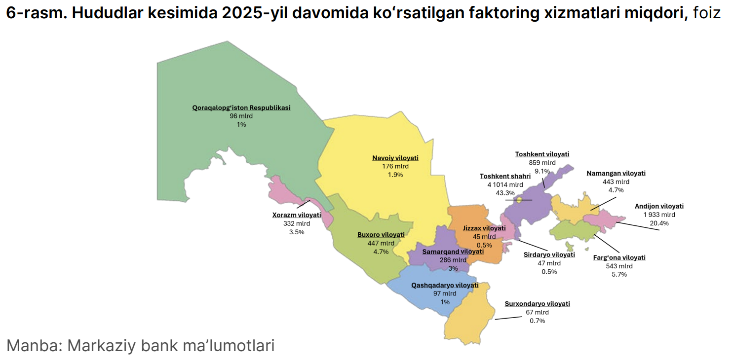 Yil davomida ko‘rsatilgan faktoring xizmatlarining 43 foizi Toshkent shahri hissasiga to‘g‘ri kelgan.