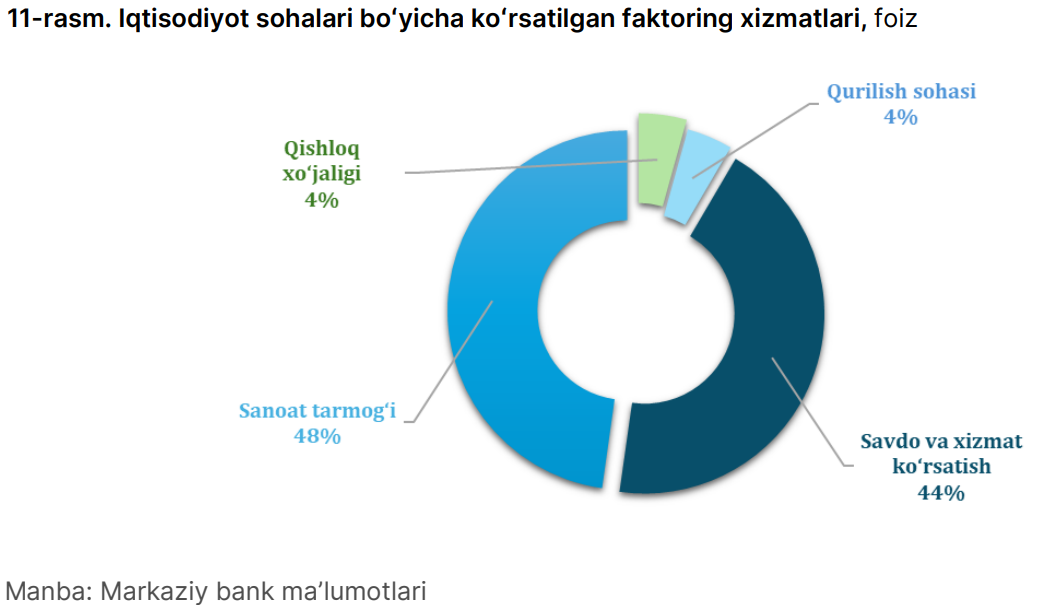 Sohalar kesimida esa faktoring xizmatlarining katta qismi sanoat sohasiga ko‘rsatilgan.