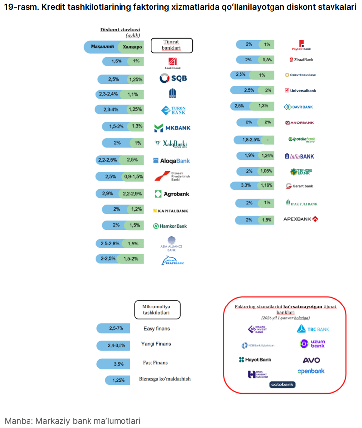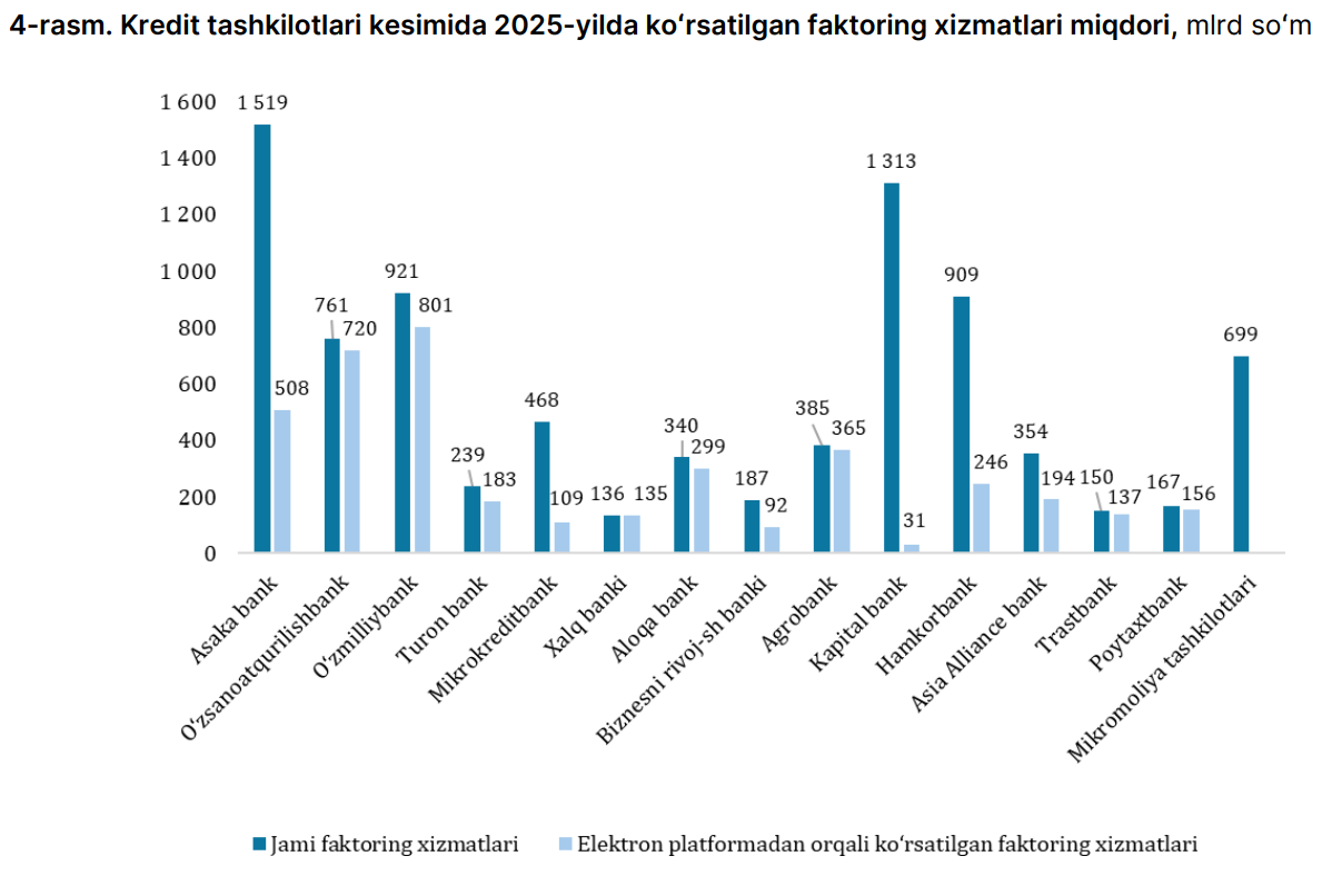 Banklar ichida Asakabank (1,5 trln so‘m) eng ko‘p faktoring xizmatini ko‘rsatgan.
