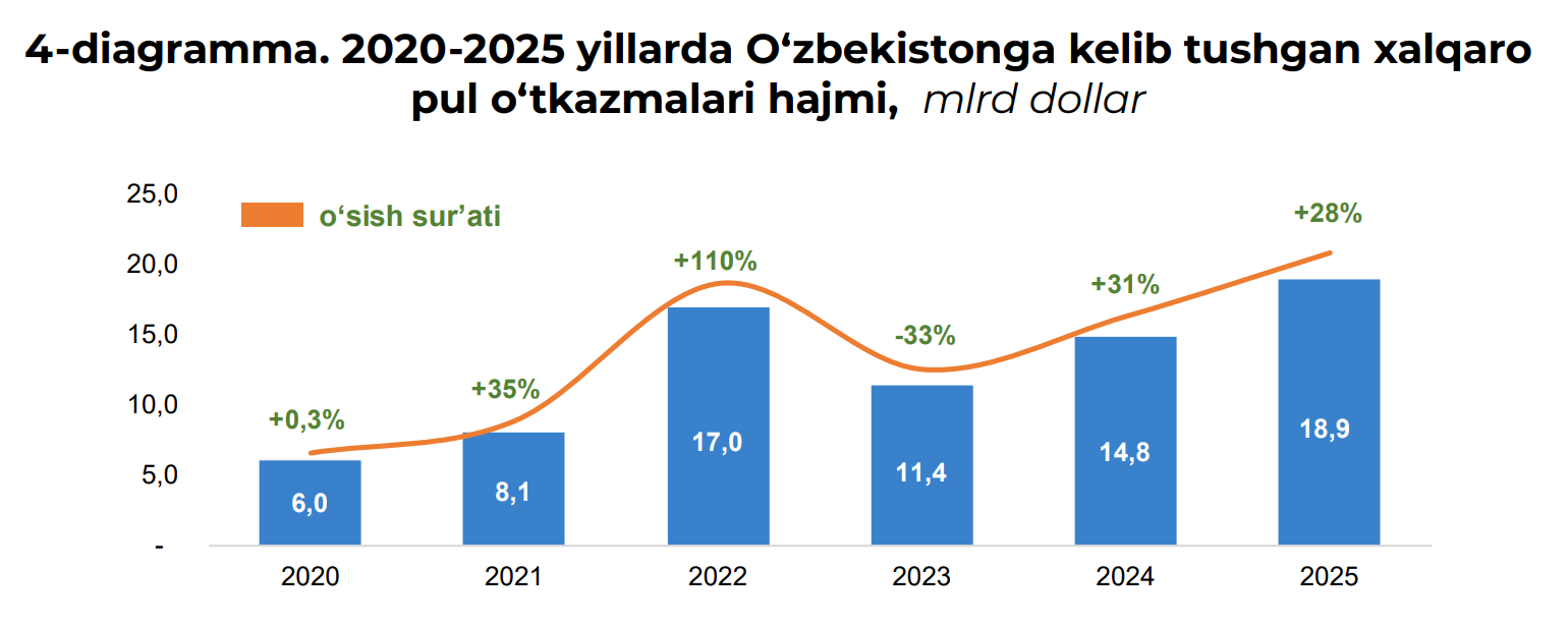 Markaziy bank ma’lumotlariga ko‘ra, 2025-yilda O‘zbekistonga pul o‘tkazmalari orqali 18,9 mlrd dollar mablag‘ kelib tushgan.