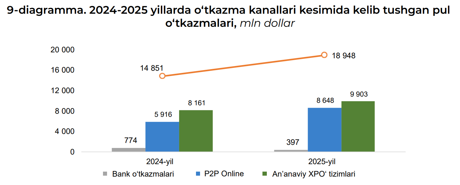 Xususan, 2024-yilda P2P orqali 5,9 mlrd dollar o‘tkazilgan bo‘lsa, 2025-yilda bu ko‘rsatkich 8,6 mlrd dollarga yetgan.