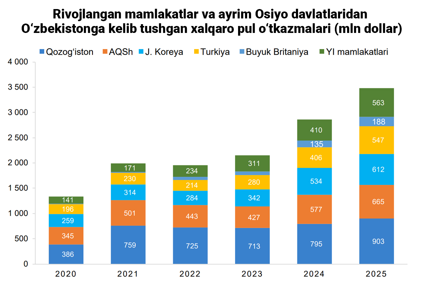 2025-yilda Yevropa hamda AQSh singari rivojlangan davlatlardan ham pul o‘tkazmalari hajmi sezilarli darajada oshgan.