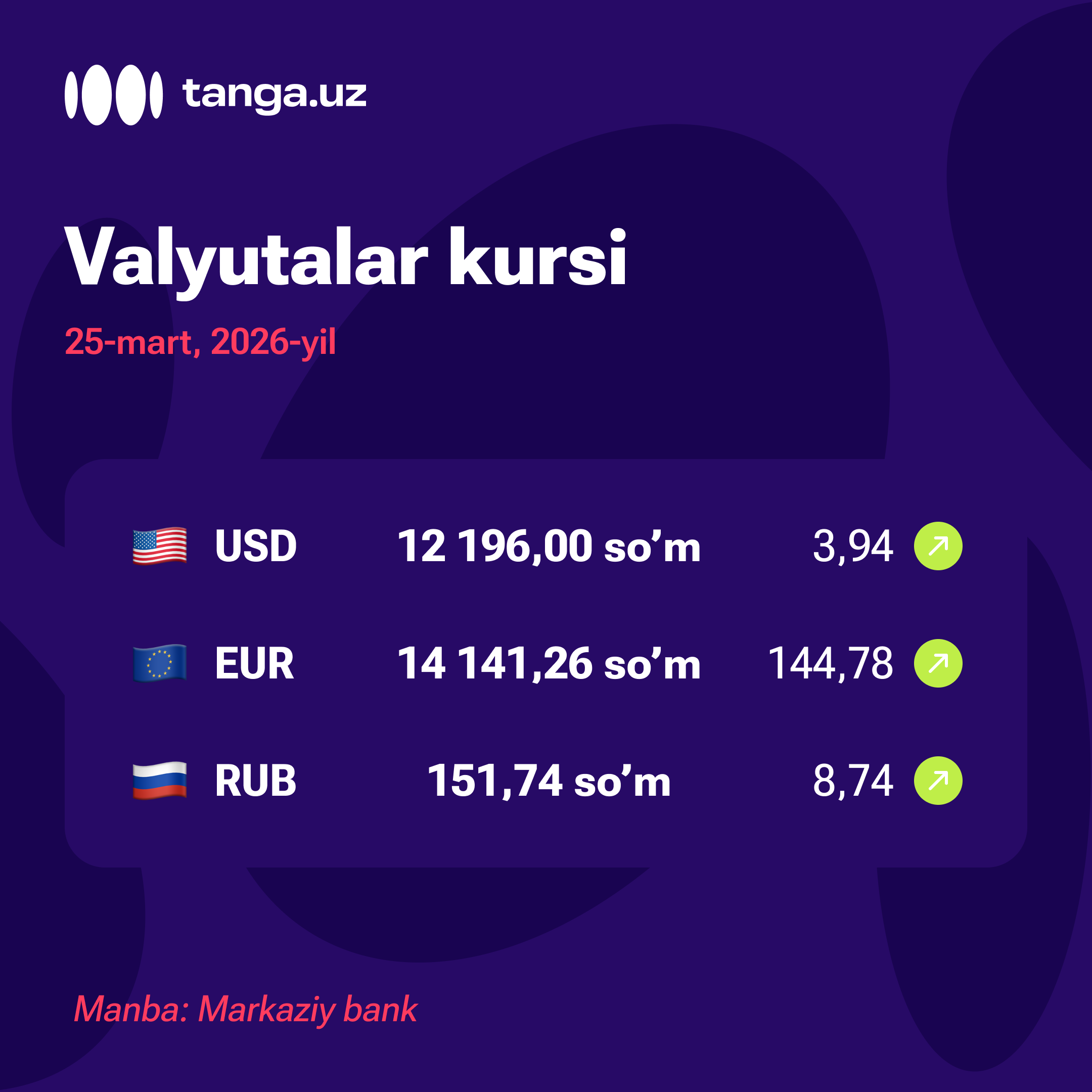 25-mart uchun rubl 151,74 so‘m, yevro esa 14 141,26 so‘m etib belgilandi. Ularning bir kunlik o‘sishi mos ravishda 8,74 so‘m va 144,78 so‘mni tashkil etdi.