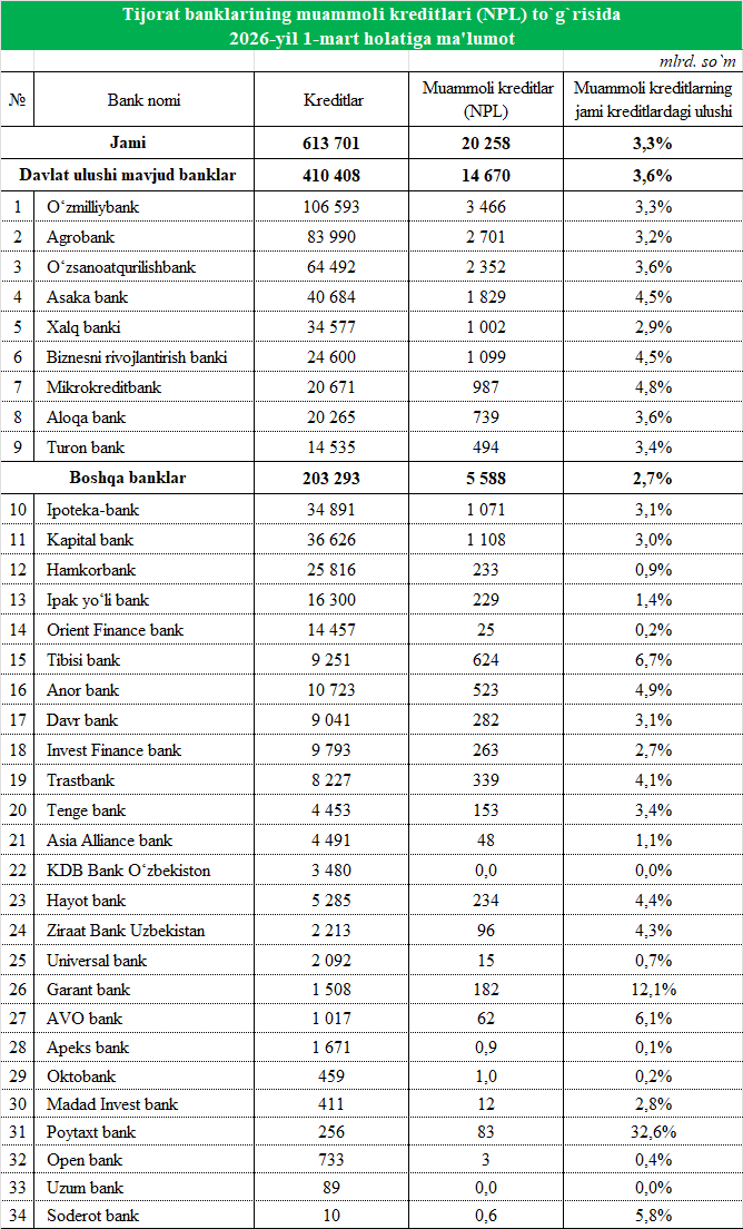 Shundan 20 trln 258 mlrd so‘mi yoki 3,3 foizi muammoli kreditlar hissasiga to‘g‘ri keladi.