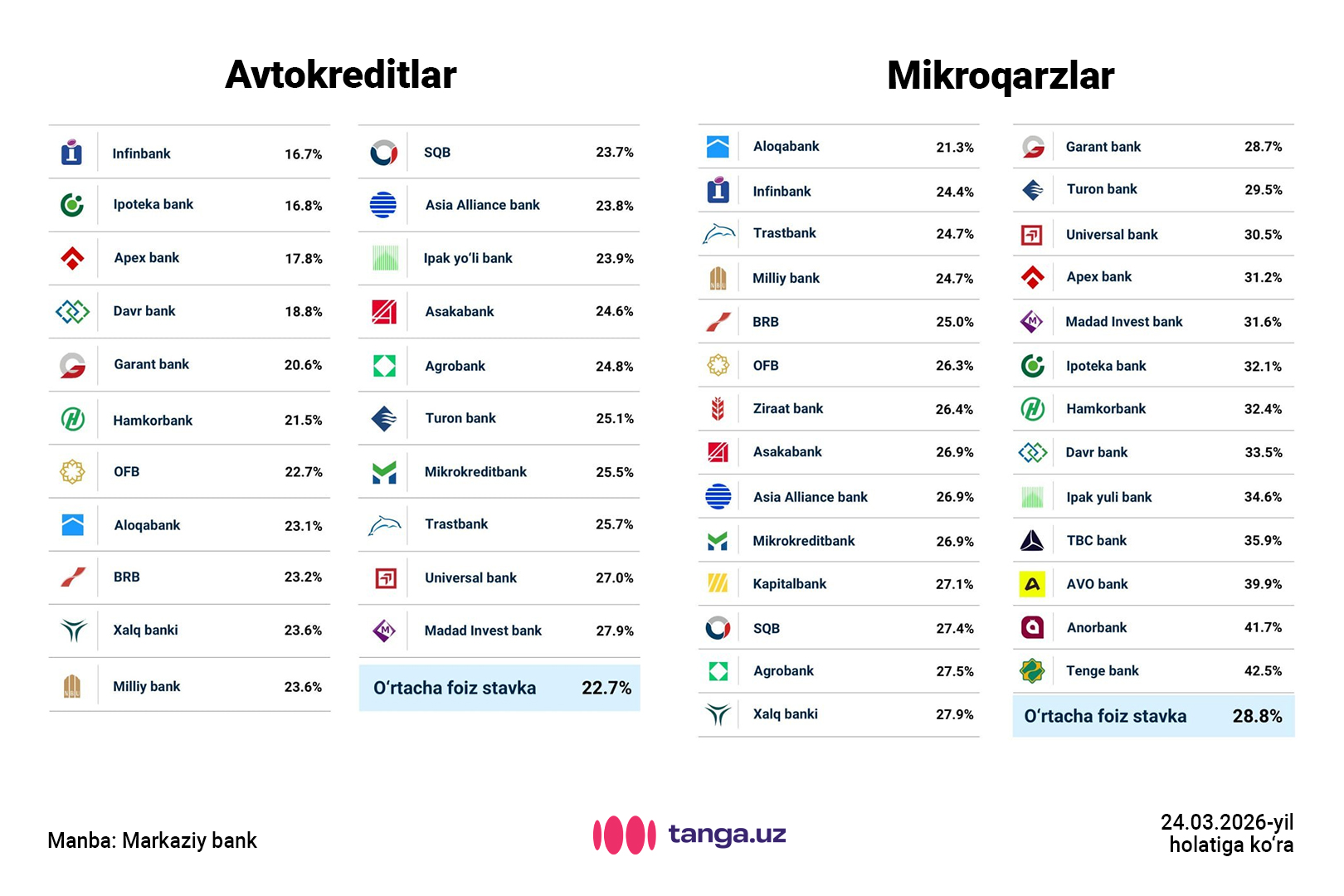 2026-yil 24-mart kuni aholiga ajratilgan mikroqarzlarning o‘rtacha stavkasi 28,8 foizni tashkil etdi.