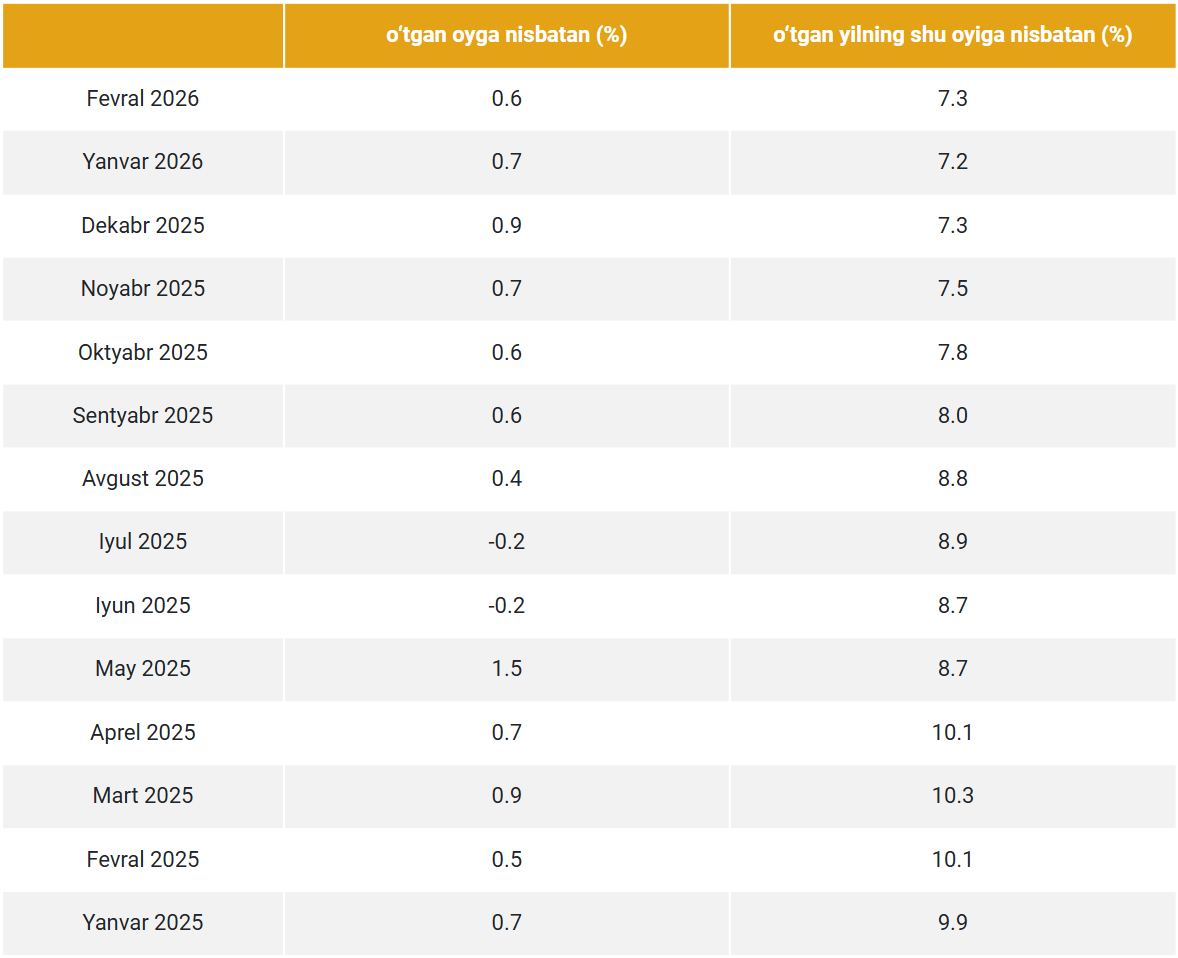 Fevral oyida inflatsiya darajasi 7,3 foizni tashkil etib, yanvar oyiga nisbatan 0,1 foiz bandga yuqori bo‘lgandi.