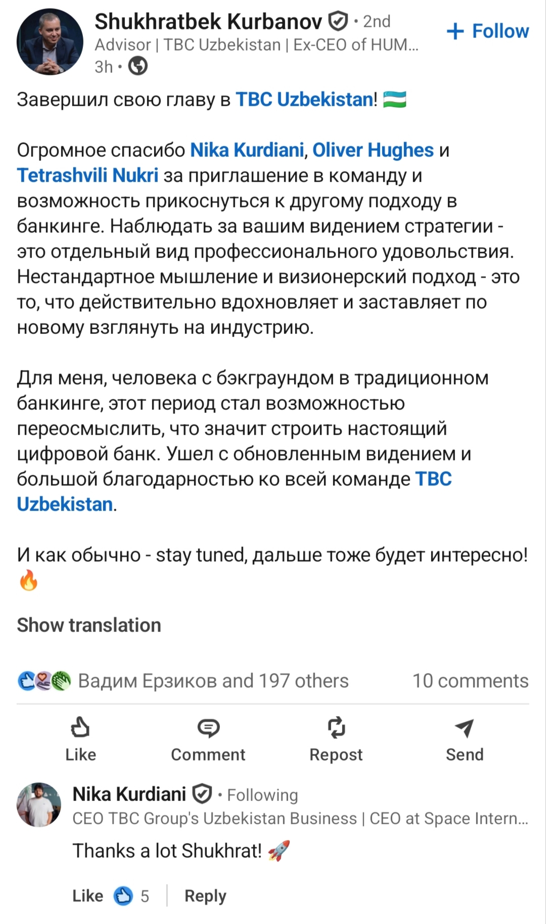 Shuhratbek Kurbonov TBC Uzbekistan boshqaruvi raisining maslahatchisi lavozimini tark etdi. Bu haqda u o‘zining LinkedIn sahifasida ma’lum qildi.