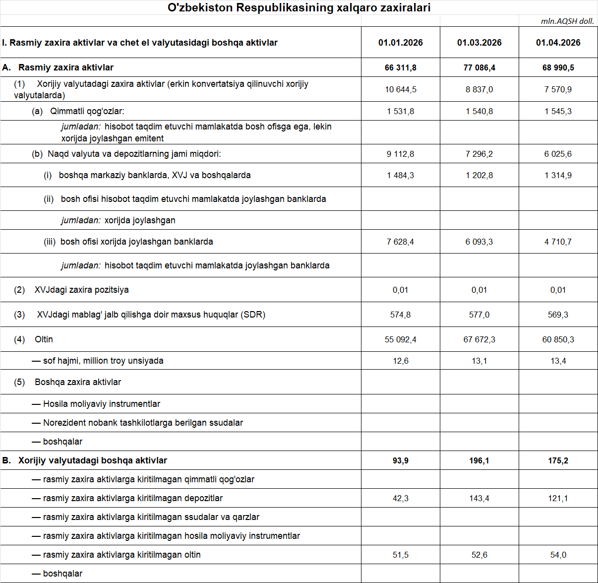 1-aprel holatiga ko‘ra, O‘zbekistonning oltin-valyuta zaxiralari 69 mlrd dollarni tashkil etmoqda.