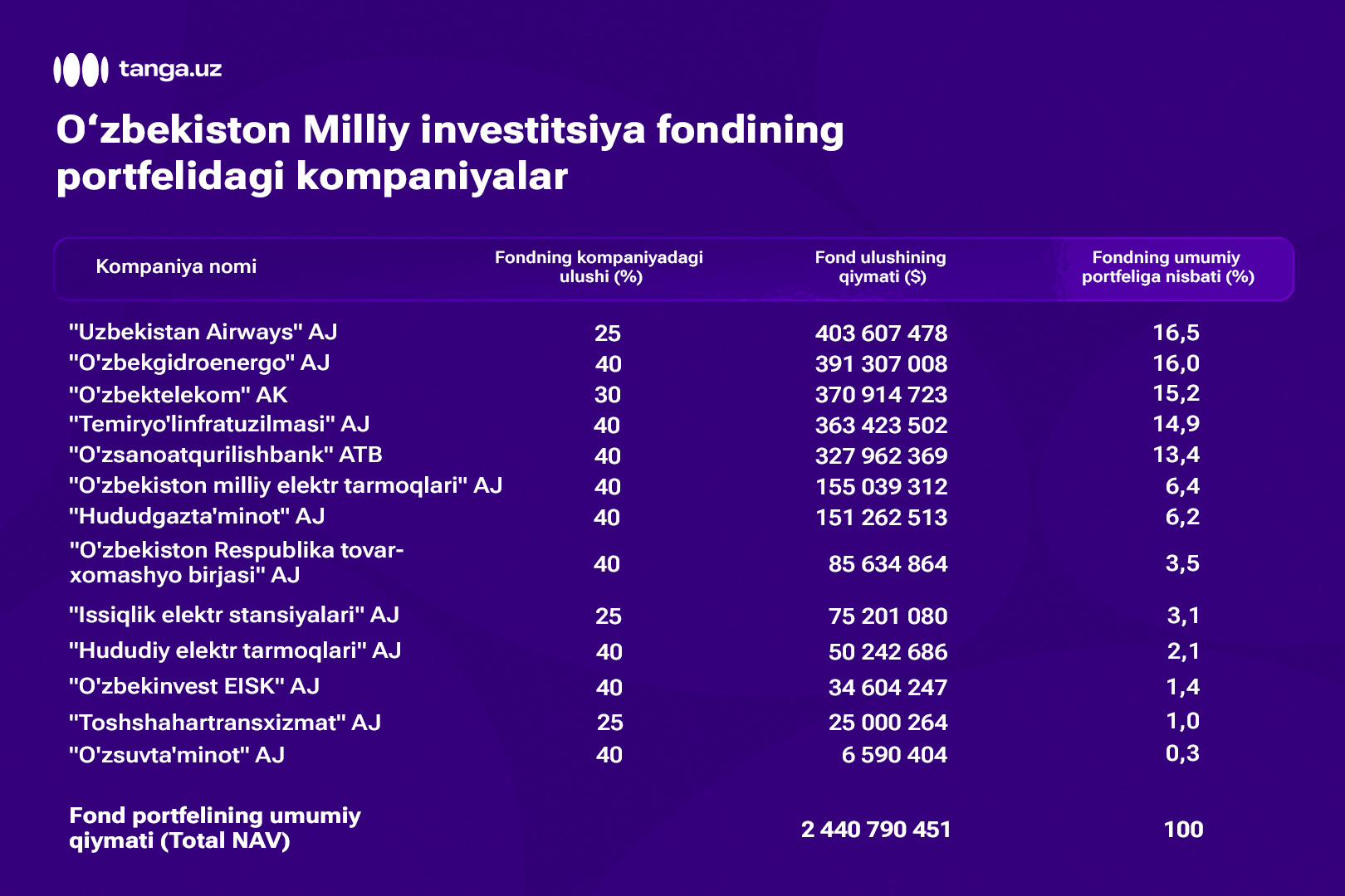 Ma’lumot uchun, UzNIF davlatga qarashli 13 ta yirik kompaniyaning 25 foizdan 40 foizgacha bo‘lgan strategik ulushiga egalik qiladi.
