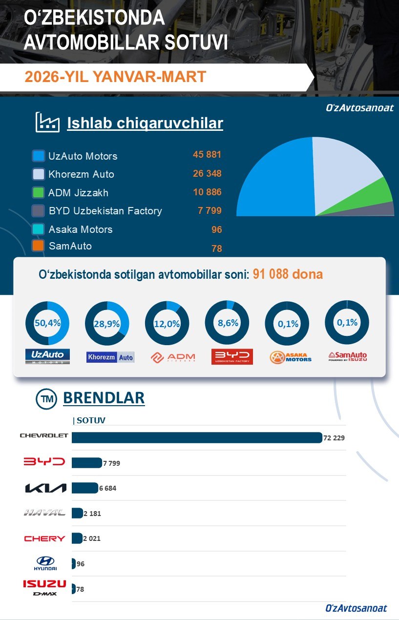 2026-yilning yanvar-mart oylarida mahalliy avtomobil ishlab chiqaruvchi kompaniyalar 91 ming 88 dona avtomobil sotdi.