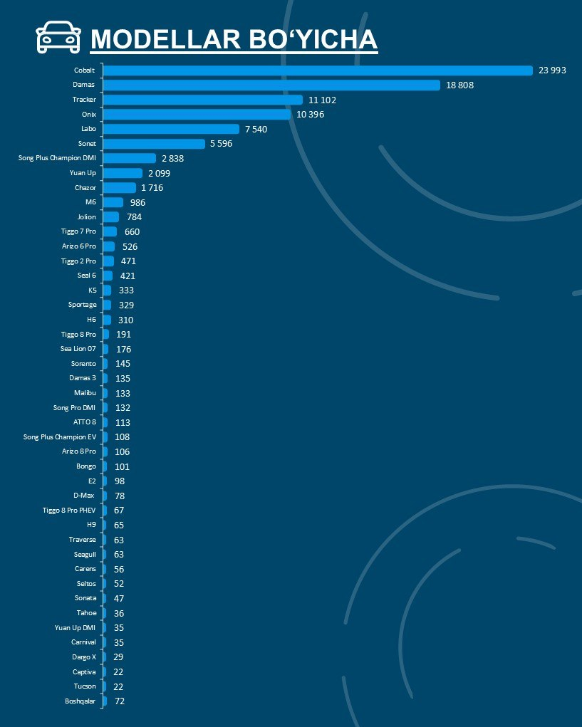 Keyingi o‘rinlarda mos ravishda Damas, Tracker, Onix hamda Labo joylashgan.