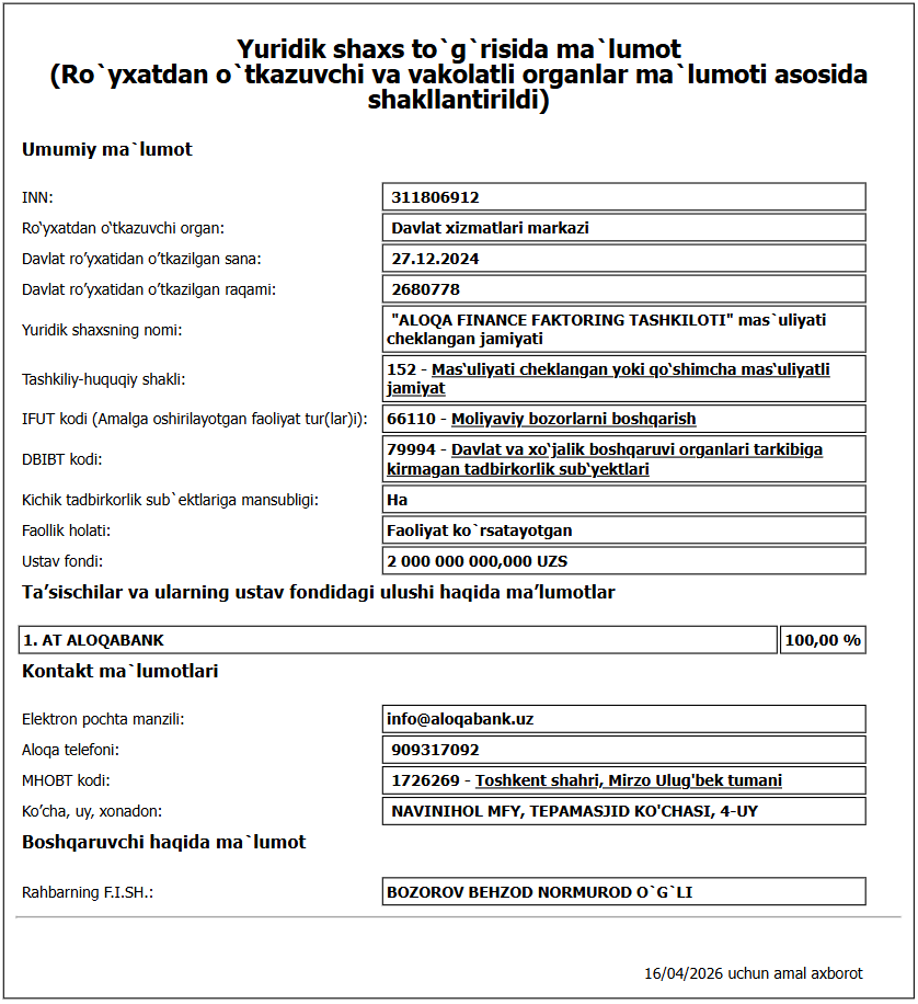 2025-yil yozida kompaniya nomi “Aloqa Finance Faktoring Tashkiloti”ga o‘zgartirilgan.