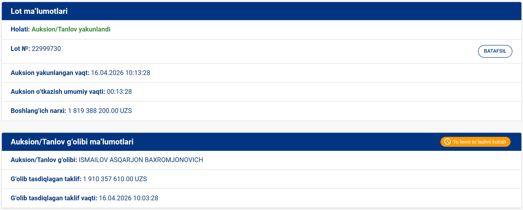 Uch daqiqadan ko‘proq davom etgan kimoshdi savdosida 1 mlrd 910 mln so‘m taklif qilgan Ismoilov Asqarjon Baxromjonovich g‘olib bo‘ldi.