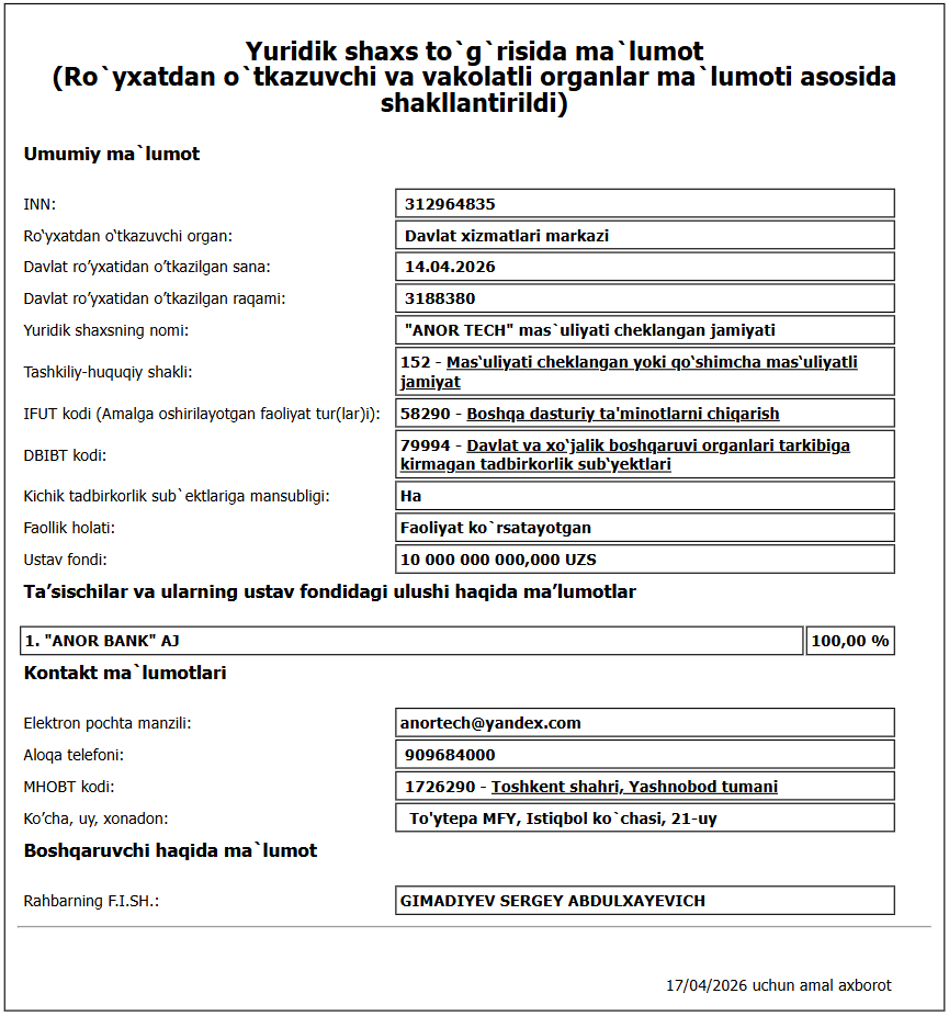 Ochiq manbalarga ko‘ra, Anor Tech korxonasi (ustav fondi 10 mlrd so‘m) 2026-yilning 14-aprelida ro‘yxatdan o‘tkazilgan.