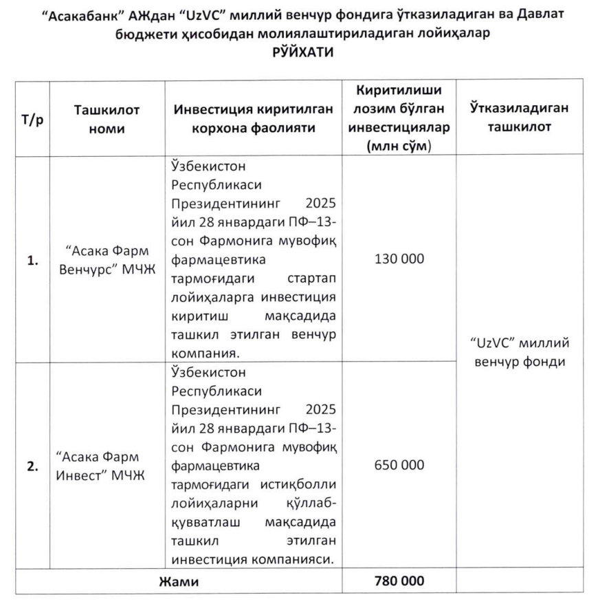 Bank moliyalashtirishi rejalashtirilgan, umumiy qiymati 780 mlrd so‘mlik farmatsevtika fondlari UzVC milliy venchur fondiga o‘tkaziladi.