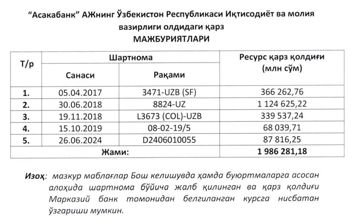 2026-yil 1-mart holatiga ko‘ra, Asakabank kredit portfeli 40 trln 684 mlrd so‘mni tashkil etmoqda.