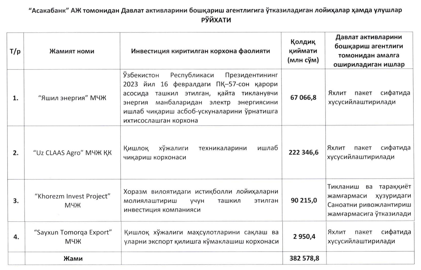 Qiymati 382,6 mlrd so‘mlik 4 ta loyiha va ulushlar keyinchalik xususiylashtirish sharti bilan agentlikka topshiriladi.