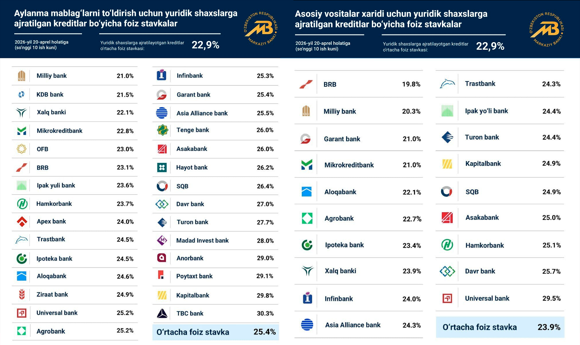 20-aprel kuni aylanma mablag‘ni to‘ldirish uchun yuridik shaxslarga o‘rtacha 25,4 foizdan kredit ajratildi.