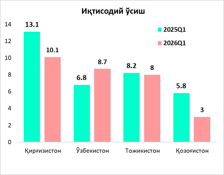 O‘tgan yilning mos davri bilan solishtirganda, O‘zbekistonning iqtisodiy o‘sishi 1,9 foiz bandga tezlashib, mintaqada eng yuqori natijani ko‘rsatgan.