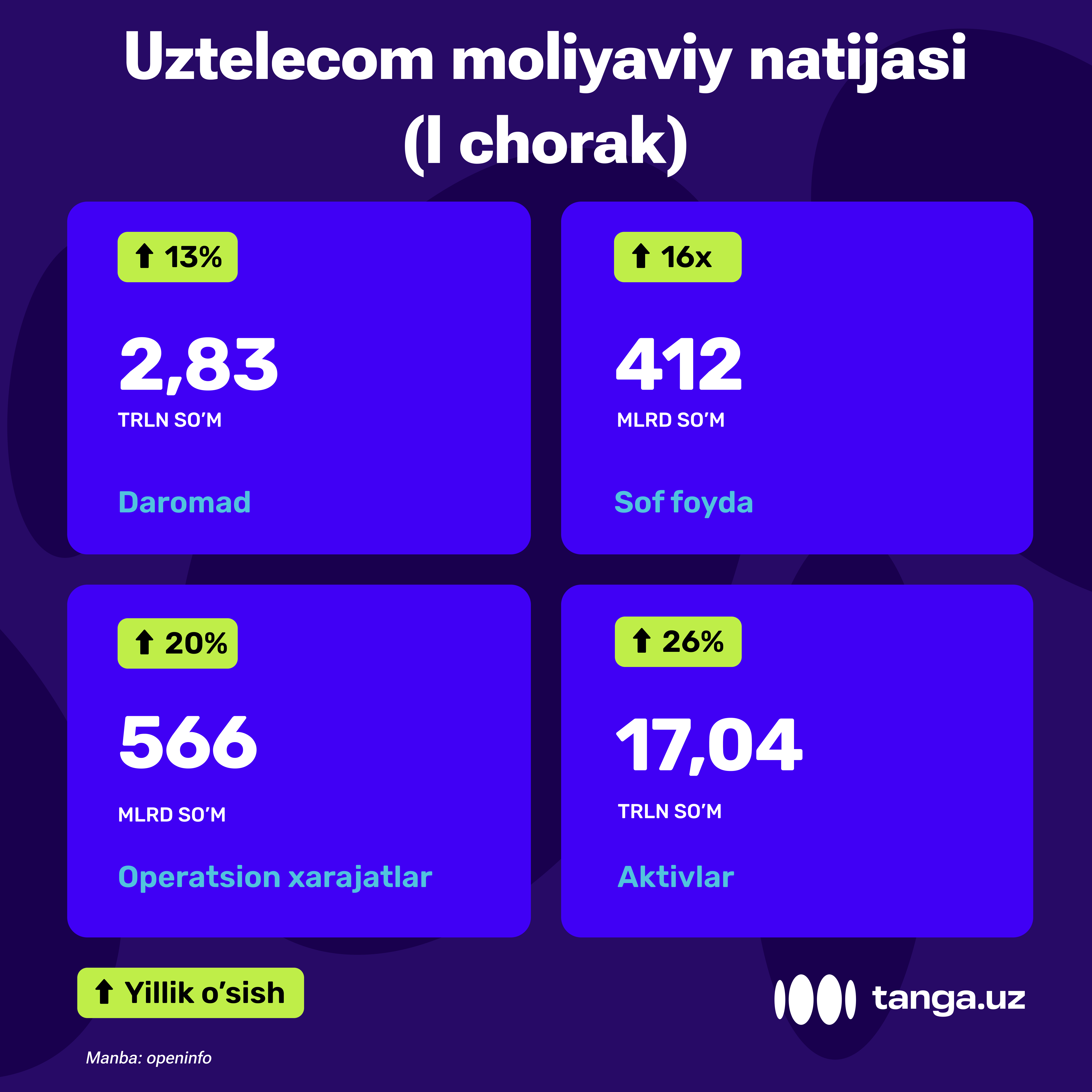 2026-yilning birinchi choragida Uztelecom aktivlari 3,5 trln so‘mga oshib, 17 trln so‘mga yetgan.