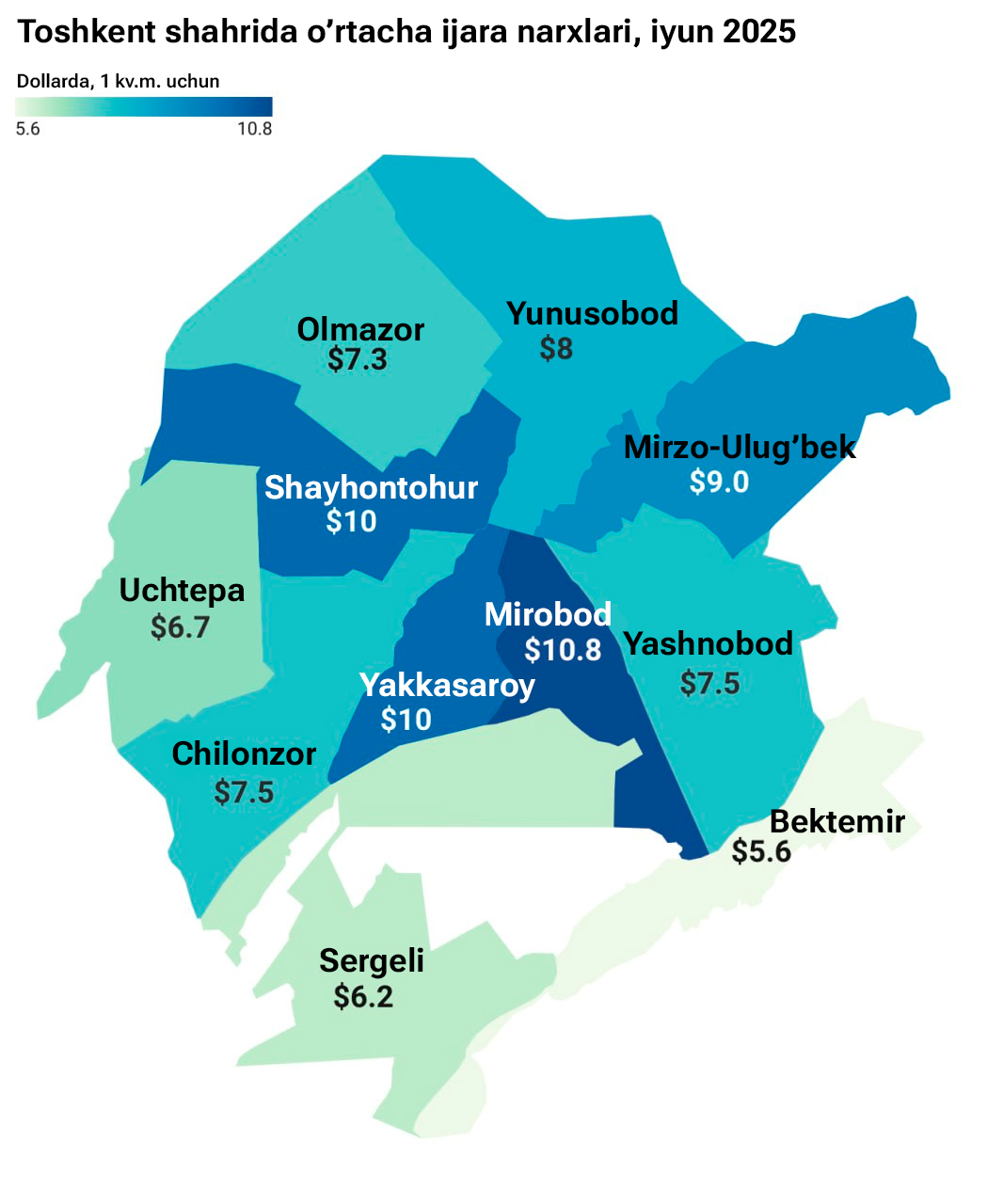 Talab va taklif yuqori bo‘lgan Toshkent shahrida ijara narxlarining barqarorligi kuzatildi. Unga ko‘ra, iyun oyida o‘rtacha ijara narxi may oyidagi 8,1 dollar darajasida o‘zgarishsiz qoldi.