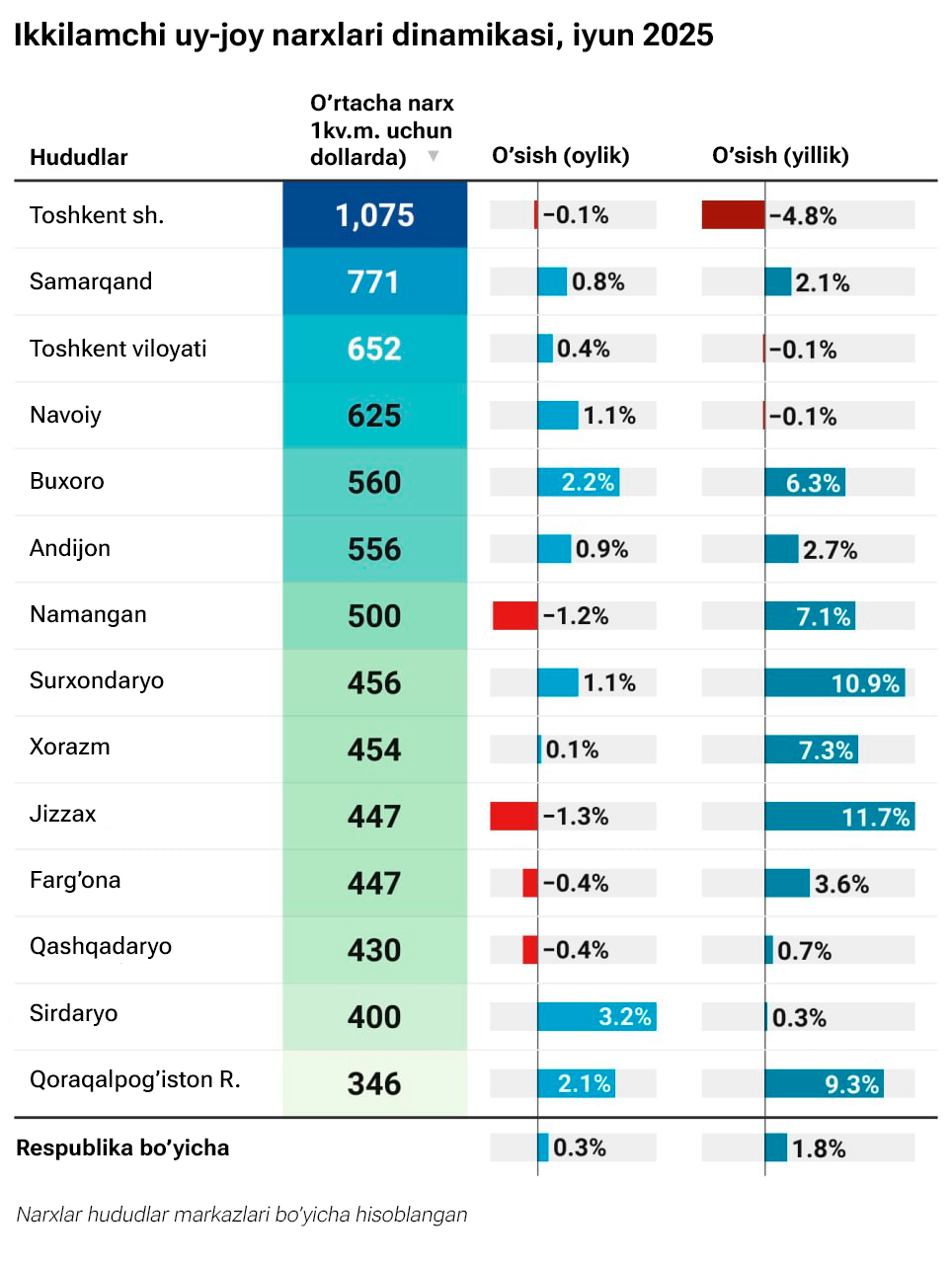 Respublika bo‘yicha ikkilamchi bozordagi uy-joylarning o‘rtacha narxi may oyiga nisbatan 0,3 foizga, so‘nggi bir yil ichida esa 1,8 foizga oshgan.
