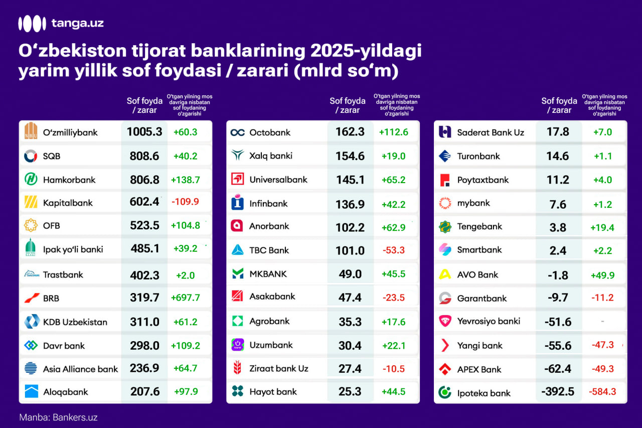 Octobank hamda ANORBANK’ning sof foyda ko‘rsatkichi esa mos ravishda 112,6 mlrd so‘m, 62,9 mlrd so‘mga oshdi.