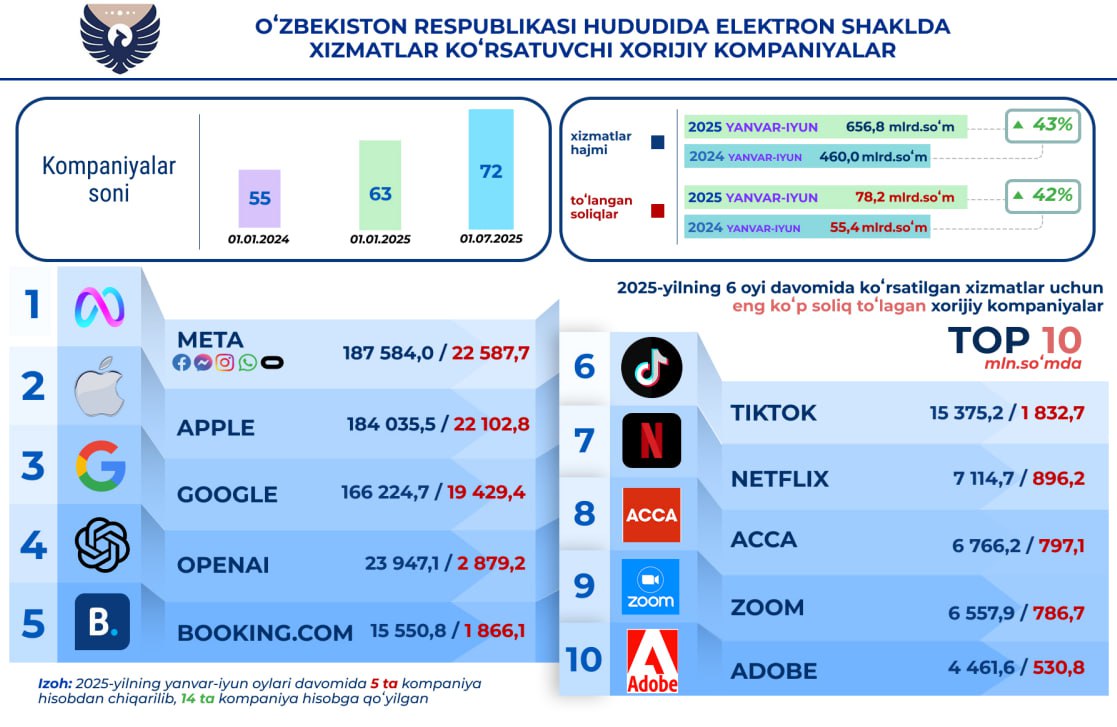 Ma’lumot uchun, 1-aprel holatiga ko‘ra, O‘zbekistonda elektron xizmatlar ko‘rsatuvchi xorijiy kompaniyalar soni 72 tani tashkil etmoqda.