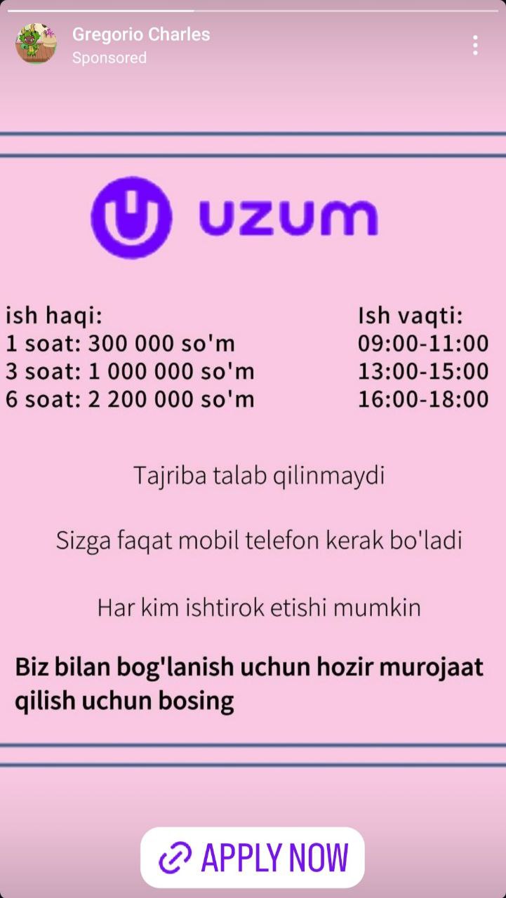 Firibgarlar endilikda Uzum kompaniyasi niqobi ostida ish taklif qilishmoqda. Bunda firibgarlar ijtimoiy tarmoqlarga 1 soatda 300 ming so‘m, 6 soatda esa 2,2 mln so'm ishlash mumkinligini aytilgan. Buning uchun faqat mobil telefon yetarli bo‘lishi aytilgan.