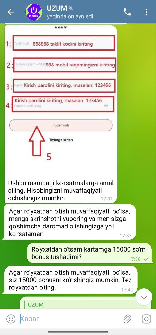 Tabiiyki, bunday daromadli ishga qiziqish bildiruvchilar ko‘pchilikni tashkil qiladi. Qiziquvchilar batafsil ma’lumot olish uchun Telegramda firibgar bilan aloqaga kirishadi.