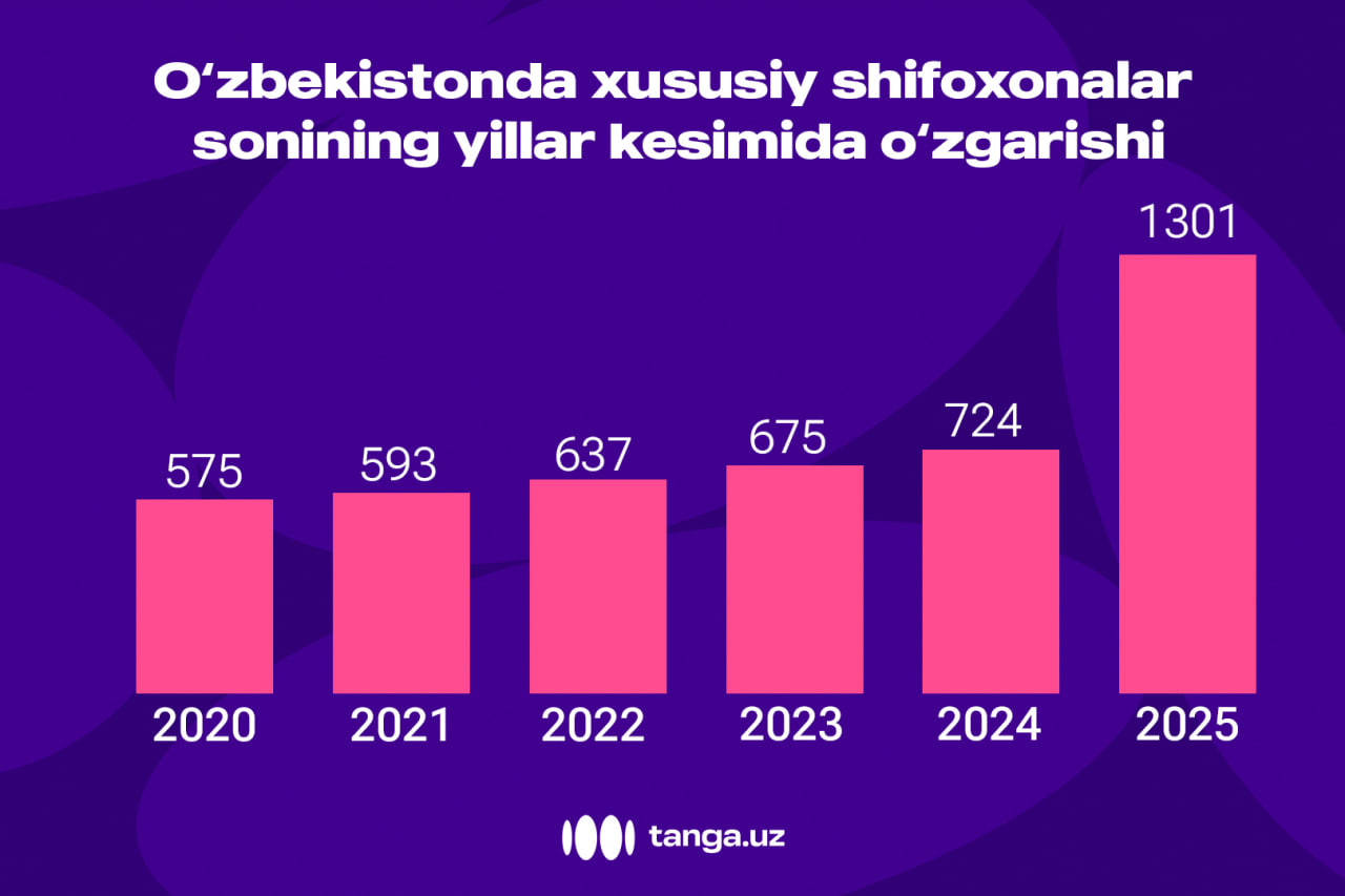 2025-yil 1-yanvar holatiga ko‘ra, O‘zbekistonda xususiy shifoxonalar soni 1 ming 301 tani tashkil etdi. Bunda yillik o‘sish 80 foizga teng bo‘ldi.