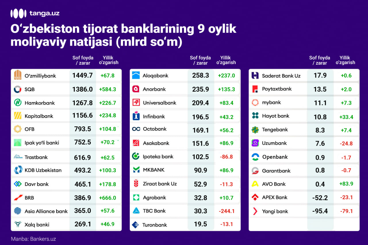 Ushbu davrda O‘zmilliybank (1,45 trln so‘m), SQB (1,39 trln so‘m), Hamkorbank (1,27 trln so‘m) hamda Kapitalbank (1,16 trln so‘m) 1 trln so‘mdan ortiq sof foyda oldi.