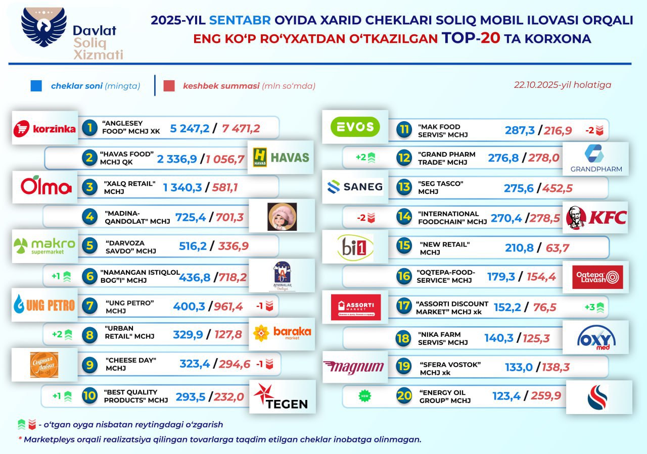 Soliq qo‘mitasi 2025-yilning sentyabr oyida cheklari eng ko‘p Soliq mobil ilovasida ro‘yxatdan o‘tkazilgan TOP-20 ta kompaniya nomini e’lon qildi.