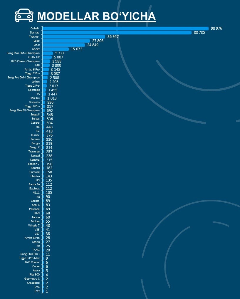 Mazkur davrda Chevrolet modellarining sotuvi 8 foizga kamaygan bo‘lsa, boshqa modellar, xususan Haval (213%), Isuzu (61%), Chery (47%), BYD (42%) va KIA (38%) modellari sotuvida o‘sish kuzatildi.