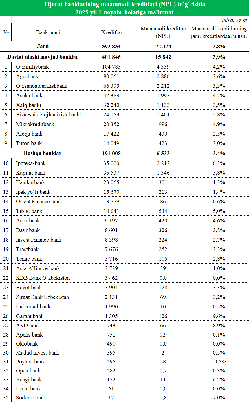 O‘zmilliybank (+866,6 mlrd so‘m), Agrobank (+298 mlrd so‘m), Asakabank (+90,3 mlrd so‘m), TBC Bank (+46,1 mlrd so‘m) larda muammoli kreditlar oy davomida nisbatan sezilarli miqdorda ko‘paygan.
