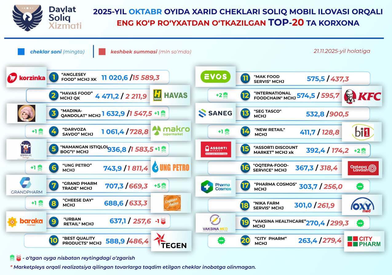 Makro supermarketlar tarmog‘i o‘sishni boshladi. Oktyabr oyida uning 1 mlndan ortiq cheklari Soliq mobil ilovasida ro‘yxatdan o‘tkazildi.