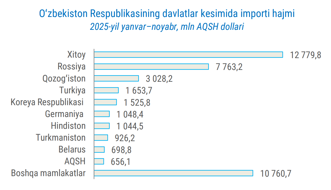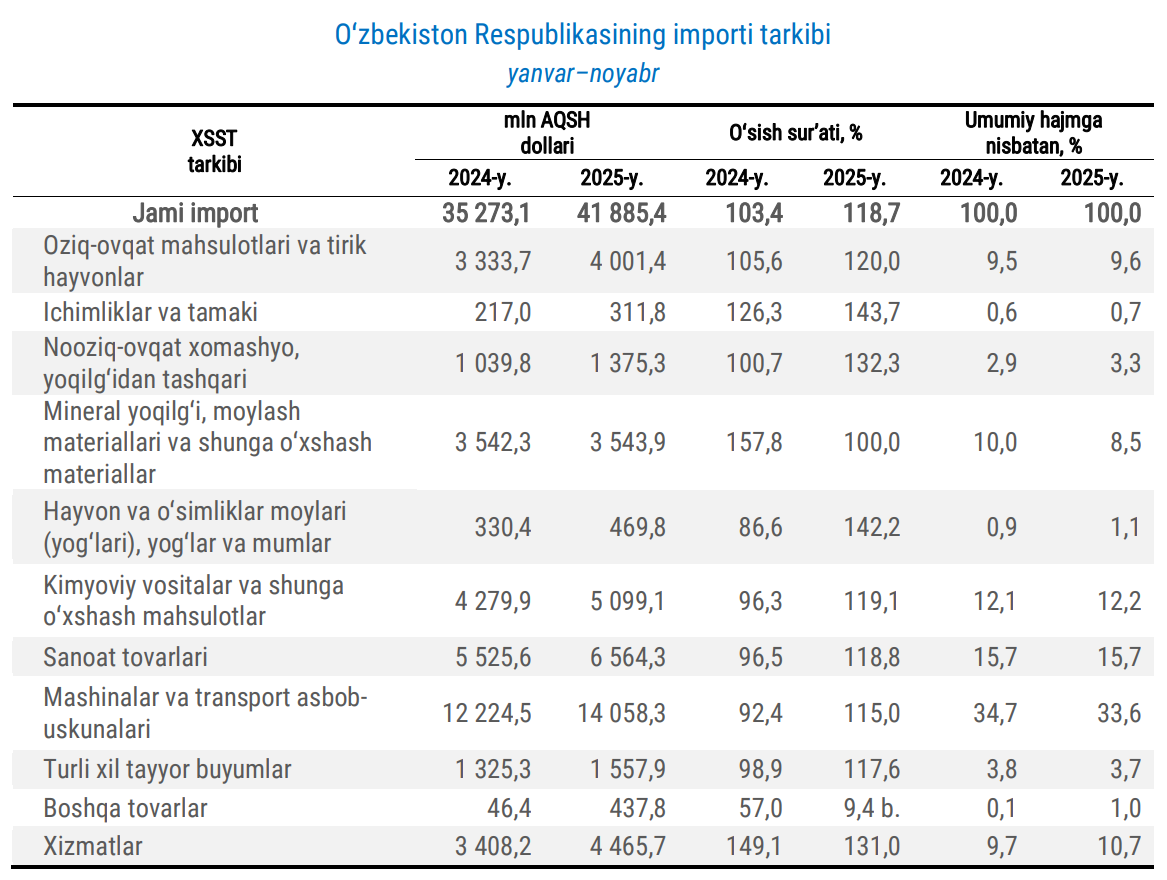 2025-yilning yanvar-noyabr oylarida O‘zbekistonning import hajmi 41,9 mlrd dollarni tashkil etdi.