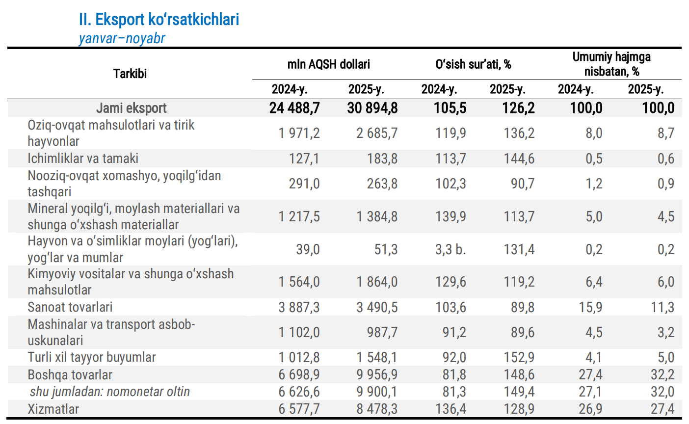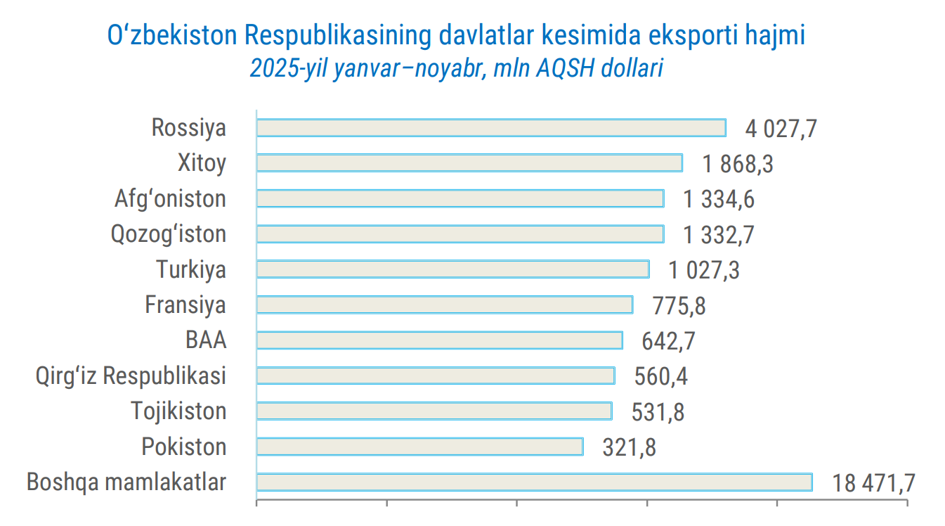 2025-yilning yanvar-noyabr oylarida O‘zbekistonning eksport hajmi 30,9 mlrd dollarni tashkil etdi. Bu o‘tgan yilning mos davriga nisbatan 6,4 mlrd dollarga yoki 26,2 foizga ko‘pdir.
