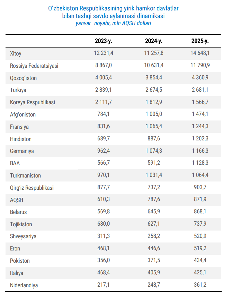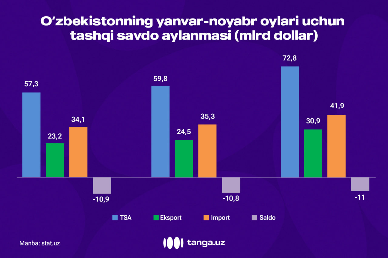 2025-yilning yanvar-noyabr oylarida O‘zbekistonning tashqi savdo aylanmasi (TSA) 72,8 mlrd dollarni tashkil etdi.