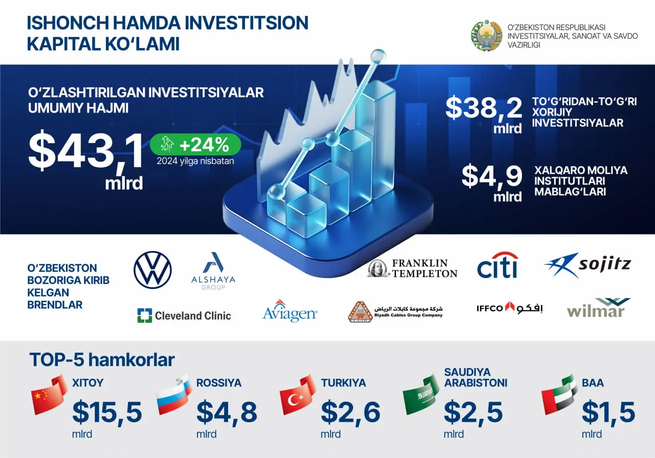 2025-yilda O‘zbekiston iqtisodiyotiga 43,1 mlrd dollar investitsiya jalb qilindi. Bu 2024-yilga nisbatan 8,3 mlrd dollarga yoki 24 foizga ko‘pdir.
